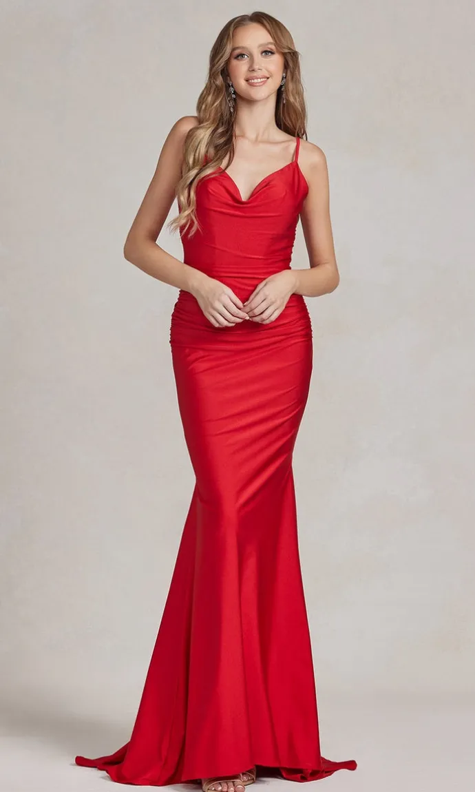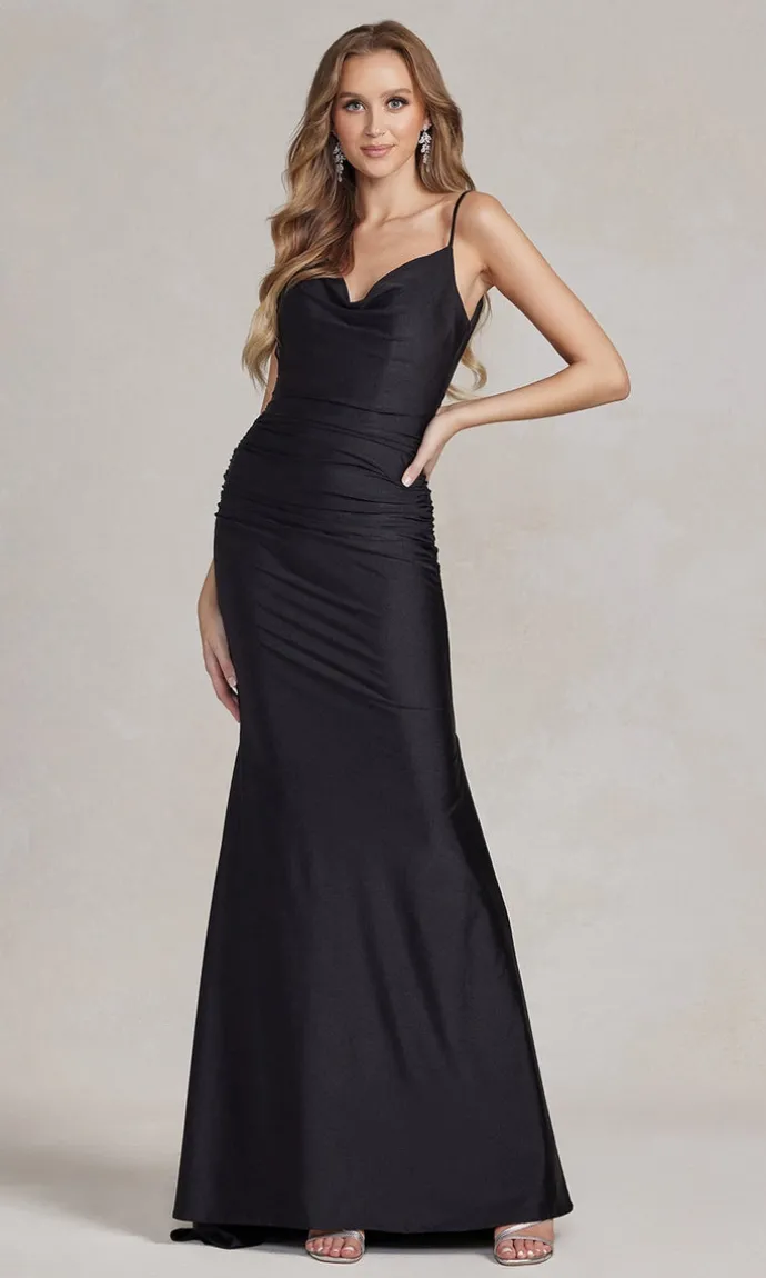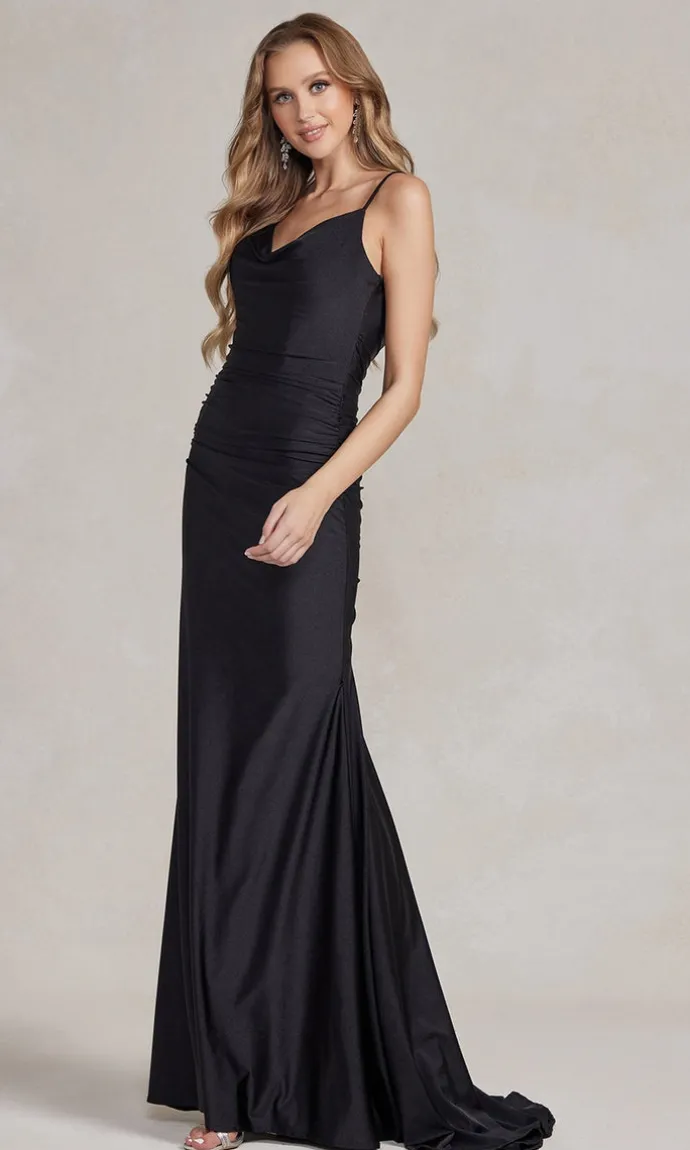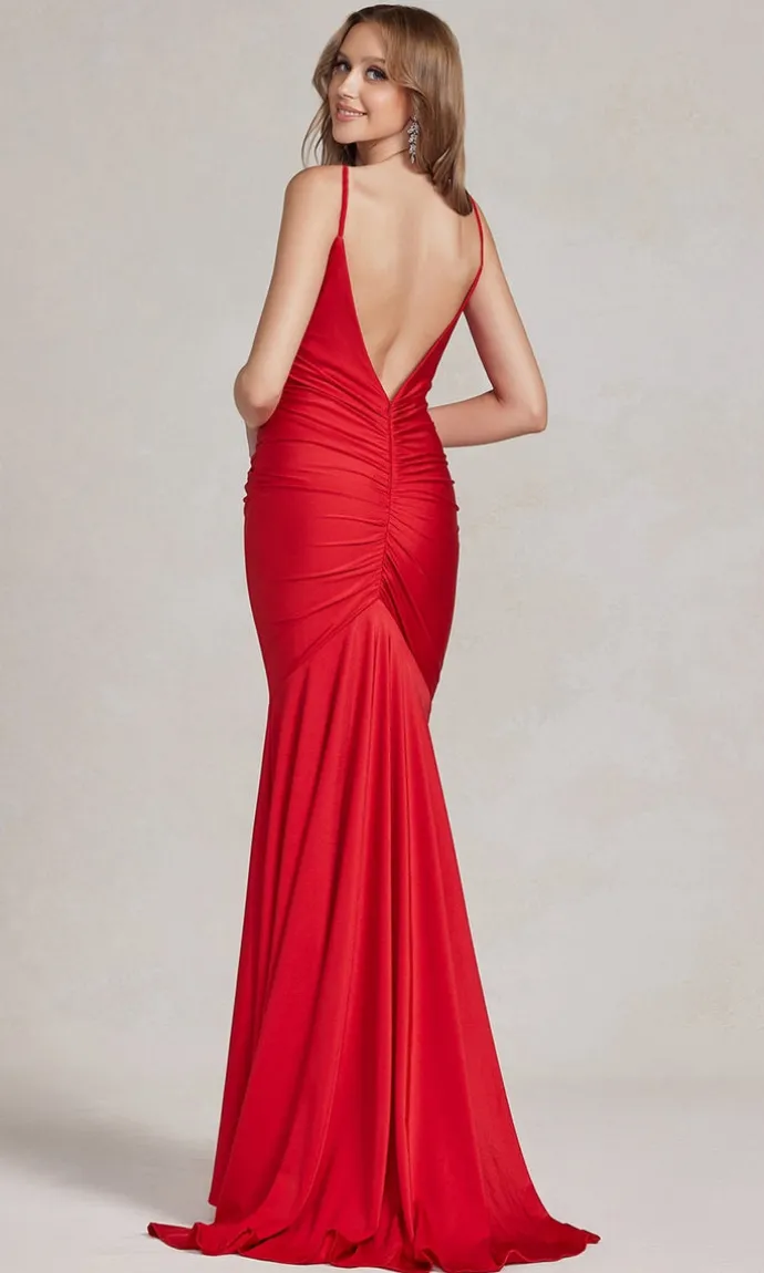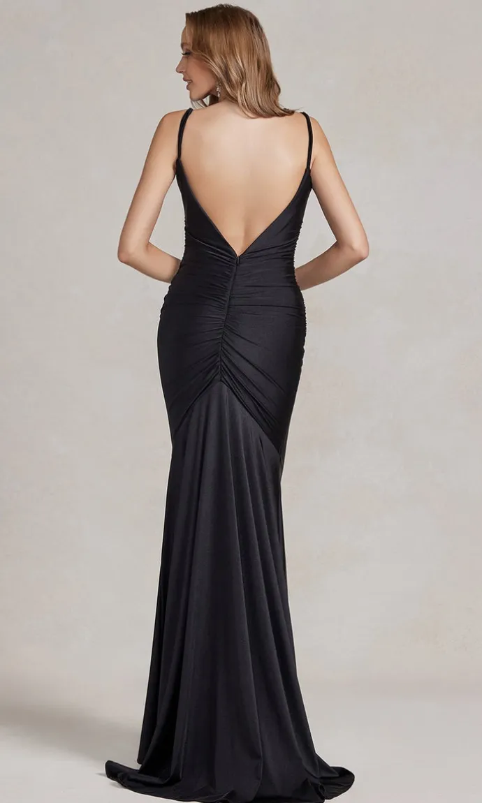 Here’s a simple long formal dress that is as beautiful as it is affordable. At under $200, this v-neck evening gown is a figure-flattering style that is certainly a bargain for prom, fancy galas, and other formal events. The elegant floor-length dress smooths over the curves from the cowled v-neckline to the floor, while side ruching adds to the curve appeal. Thin shoulder straps lead to the deep v-back detail, while booty-hugging back ruching and a volumizing godet provide the drama. Richly designed for the savvy girl who loves to find an upscale style at a bargain, this simple long formal dress highlights the silhouette without emptying your wallet.