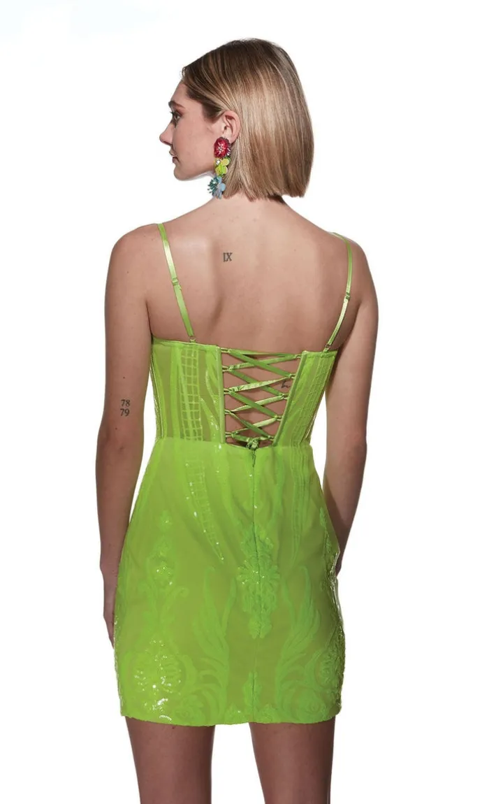From Alyce Paris, this short sequin-print homecoming dress 4901 is a radiant choice for your exciting night. Whether you’re going to homecoming, a wedding reception, or another semi-formal event, this fabulous short sequin-print cocktail dress is sure to shine under the lights. The short sequin-print party dress has a plunging v-neckline and thin adjustable shoulder straps that lead to the lace-up open back that offers a sexy look, while the mini skirt ends well above the knees. Captivate the crowd when you choose to make your entrance in this short sequin-print homecoming dress from Alyce Paris.