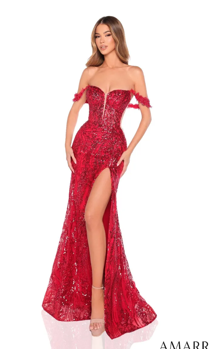 This designer sequin prom dress makes a bold statement with intricate 3D floral accents on its draped off-the-shoulder straps. Sheer side panels create a flattering, sculpted effect, while an adjustable lace-up back ensures a custom fit. A high leg slit completes the look, adding movement and a touch of allure to this shimmering gown.