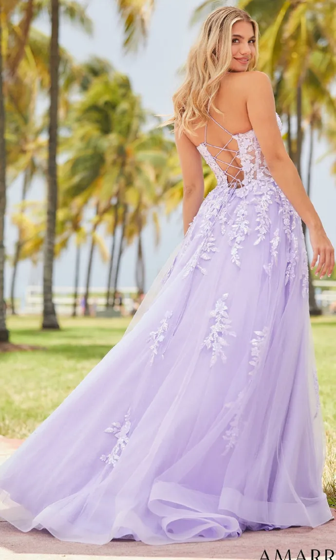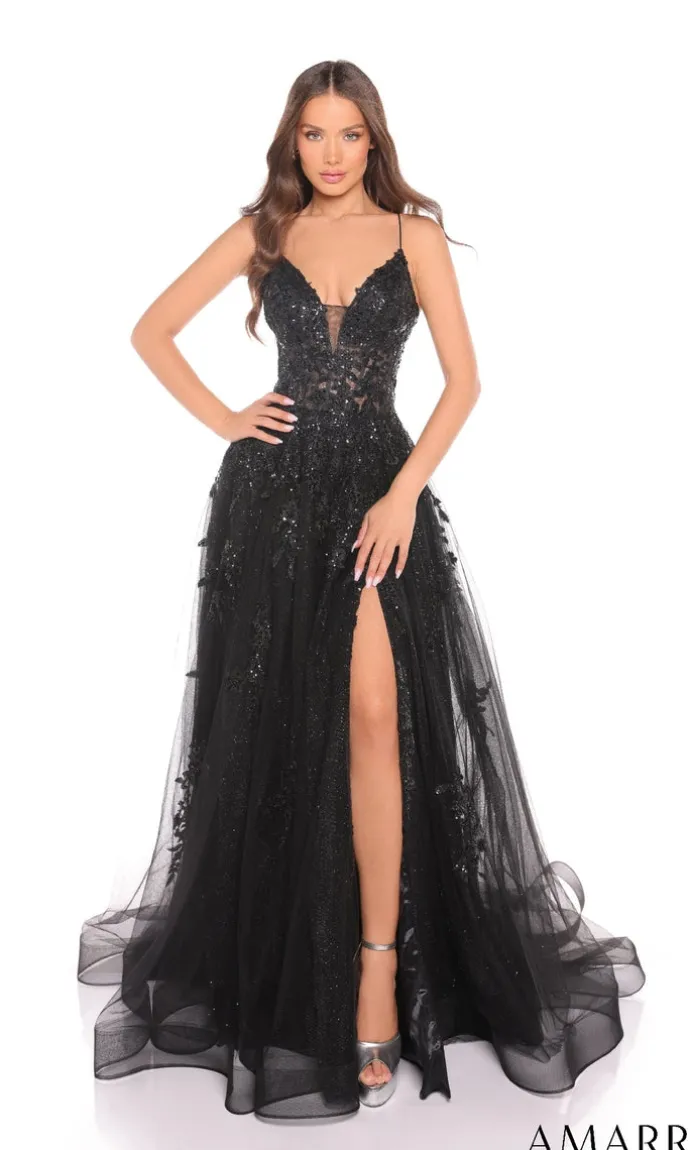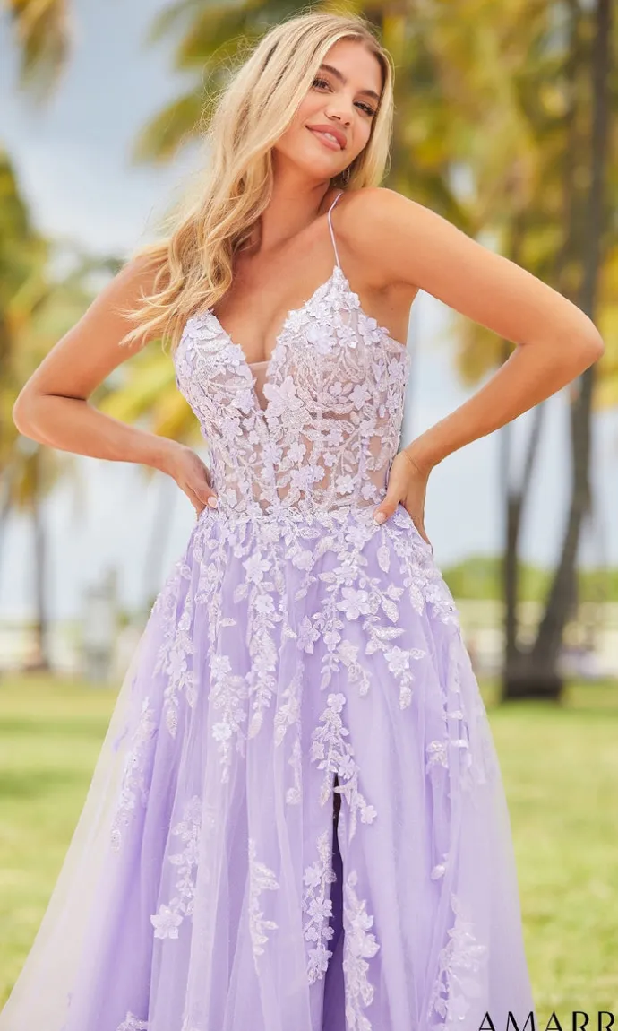 Introducing the stunning Amarra Long Formal Dress 88624, featuring a gorgeous sheer floral lace-embroidered bodice and a sparkly tulle a-line skirt with scattered floral embroidery. This dress also includes thin crisscross straps that lead to an adjustable lace-up open back, and a front slit for added elegance.