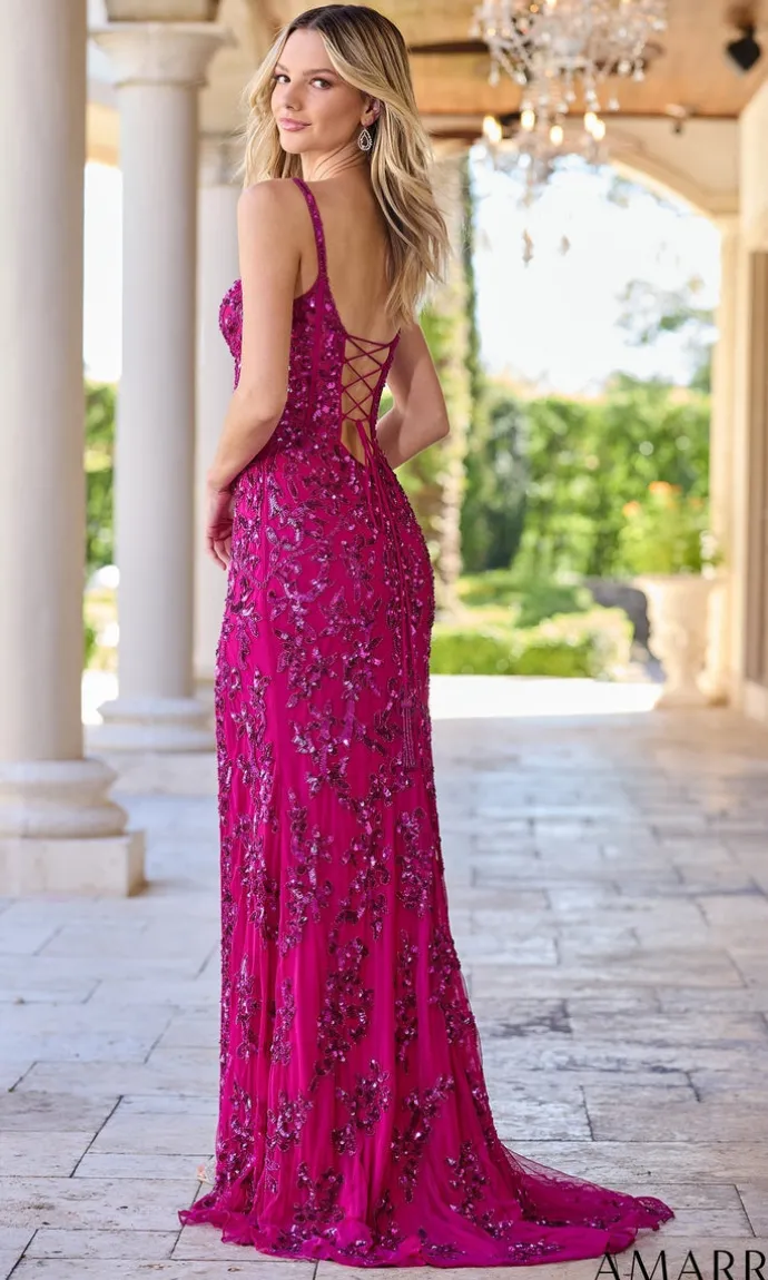 Add an elevated edge to your formal attire with this stunning long beaded prom dress 94306 from Amarra. Its eye-catching sparkly designs, plunging v-neckline, and lace-up open back create a sexy and glamorous look that is perfect for prom, galas, and black-tie events. Available in misses and some plus sizes, this dress features a floor-length skirt with a thigh-high side slit. Make a statement and feel like the heroine of your own story with this long beaded designer dress.