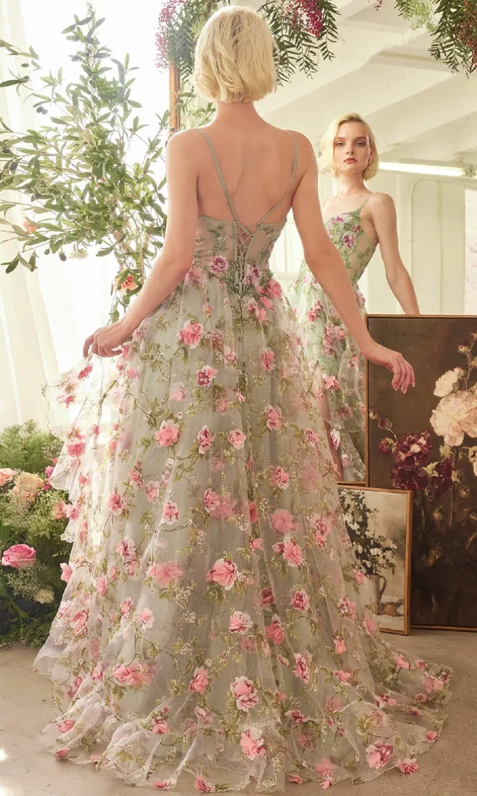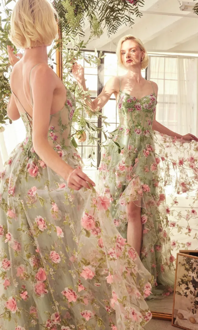 Whimsical and romantic, this floral print prom dress is a fairytale come to life. The sheer bodice reveals a structured corset for a touch of modern edge, while the lace-up back offers an adjustable fit. A layered organza a-line skirt adds volume and graceful movement, making this gown a dreamy choice for prom, garden parties, or any formal event with a magical vibe.