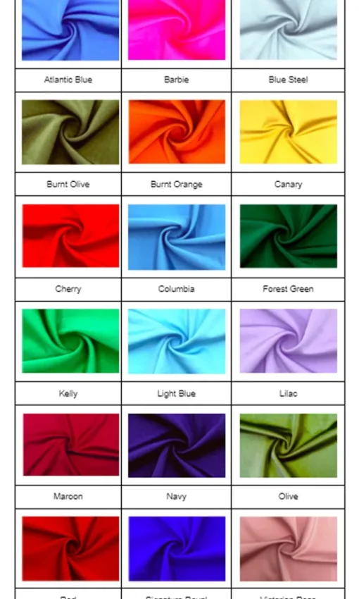 | Colour | Cherry, Atlantic Blue, Barbie, Blue Steel, Burnt Olive, Burnt Orange, Canary, Columbia, Forest Green, Kelly |
