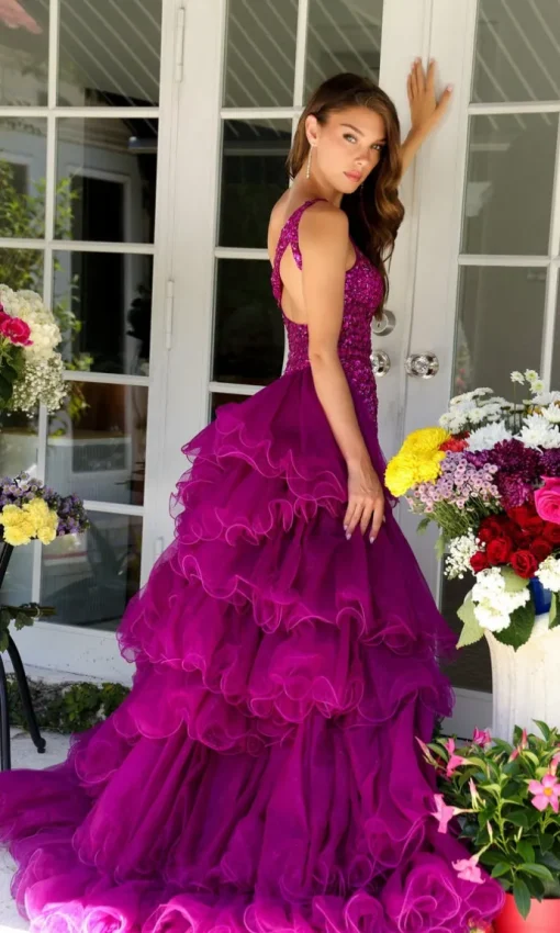 This stunning beaded one-shoulder long prom dress 29236 by Ava Presley is sure to earn you endless compliments. From the asymmetrical neckline to the floor, this evening gown is fully adorned with exquisite beading. The long ruffled overskirt adds a romantic touch, flowing gracefully in tiers to the floor. Available in misses and some plus sizes, this formal dress features a long, hip-skimming skirt with a wide side slit for a sultry look. Perfect for prom, galas, and other black-tie events, it exudes timeless beauty and unique style. Get ready to be the center of attention in this show-stopping one-shoulder long prom gown.