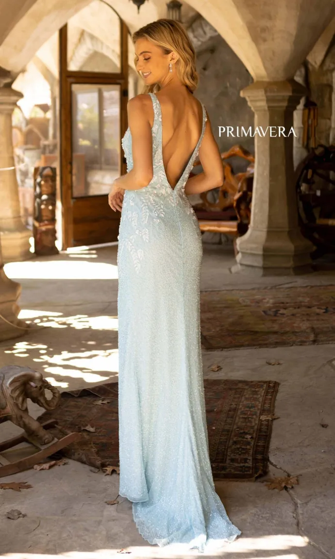 This beautiful long sequin gown is as sparkly as it is elegant. An obvious must-have for prom, galas, and other formal events, this long designer dress from Primavera features beaded floral designs that flow from the v-neck bodice, past the waist, and onto the hips. The long formal dress includes supportive shoulder straps that lead to the deep v-back detail, and a hip-skimming long skirt that opens in a side slit before reaching a dramatic floor length. Offered in misses and some extended sizes, this stylish long sequin gown is well-suited for the fashionista who loves a grander than grand entrance.
