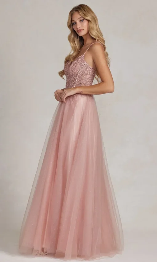 Beaded-Bodice Rose Gold Long Prom Ball Gown