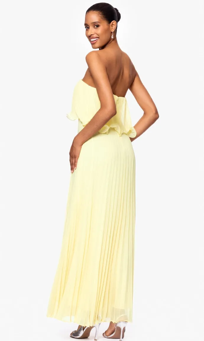Effortlessly elegant, this strapless flowy dress is a perfect pick for wedding guests and special occasions. The popover bodice with a rolled hemline adds a soft, romantic touch, while vertical pleating enhances the airy movement of the a-line skirt. Finished with a hidden back zipper, this long dress combines comfort and charm in a timeless silhouette.