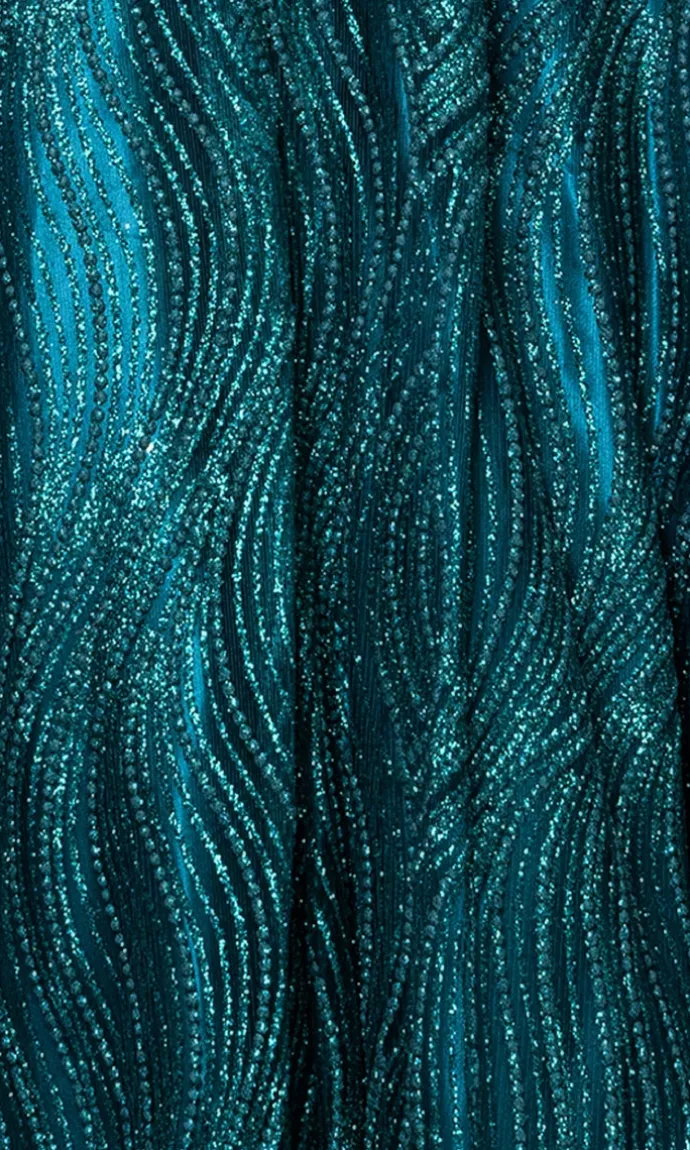 Shine from every angle in this glitter a-line prom dress by Blondie Nites. Featuring a swirling glitter design and deep v-neckline, this junior-sized gown brings both sparkle and sophistication to your special night. Thin straps lead to an open back with lace-up detailing for a flirty finish, while the full a-line skirt flows effortlessly to the floor. Side pockets add a practical touch to this glamorous look—perfect for prom, galas, or any formal event where you want to glow.