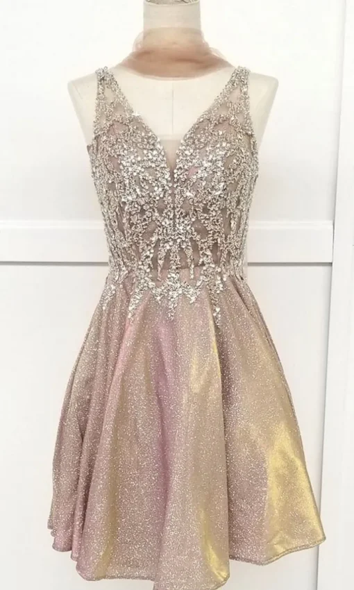 Get ready to shine all night in this stunning beaded-bodice short glitter homecoming dress J009 from Chicas. Available in misses and plus sizes, this dress features a beaded v-neck bodice with sheer details on the shoulders and back, adding a flirty touch to your look at homecoming, wedding receptions, and other semi-formal occasions. The short a-line skirt is adorned with glitter and flows beautifully to the hem, creating a flattering silhouette. With a price tag under $150, this dress is a top pick for any special event.
