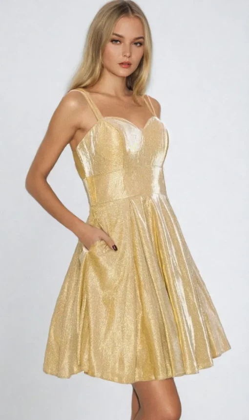 This short homecoming dress features a glittery a-line silhouette, complete with pockets and a flattering sweetheart neckline. The addition of pockets makes it perfect for carrying small essentials, while the glittery design and sweetheart neckline add a touch of elegance and glamour to any occasion.