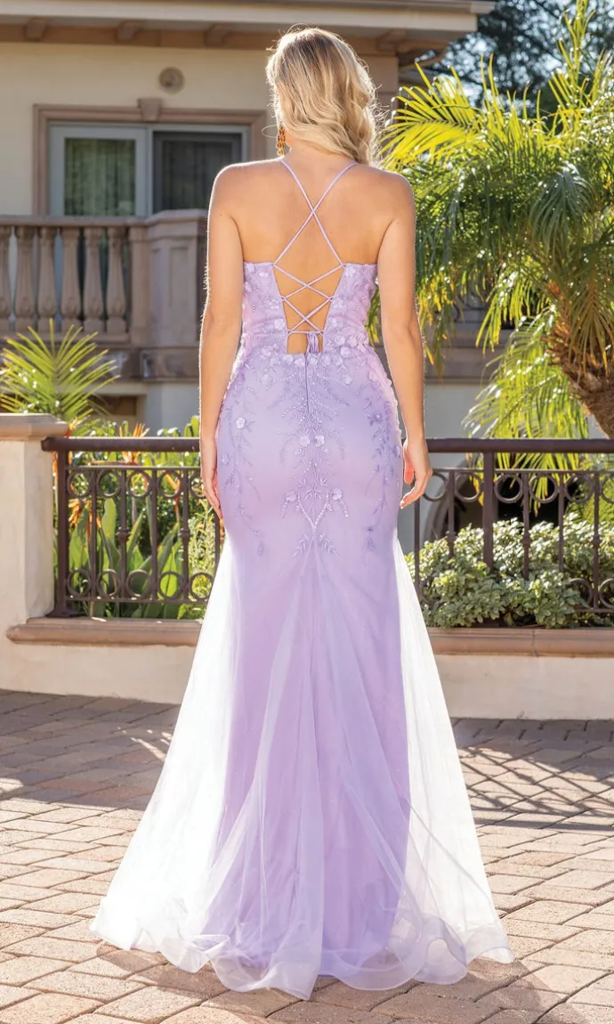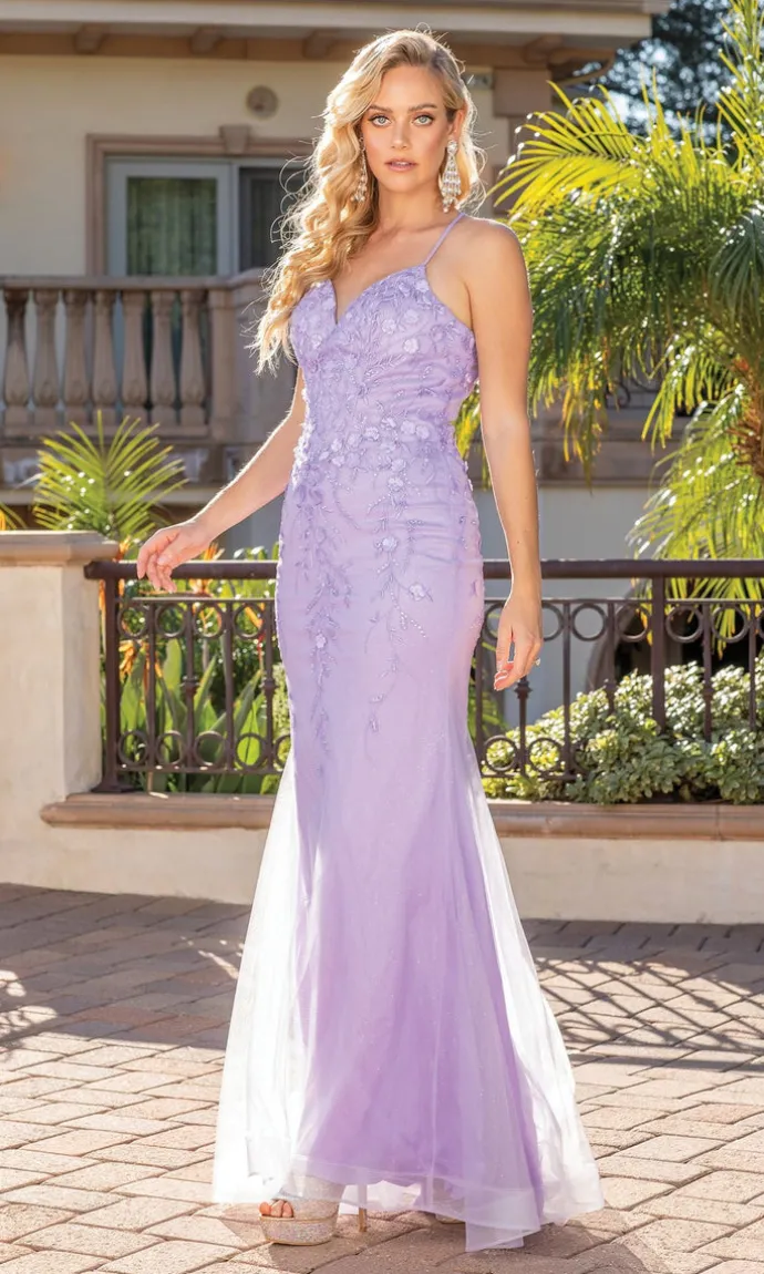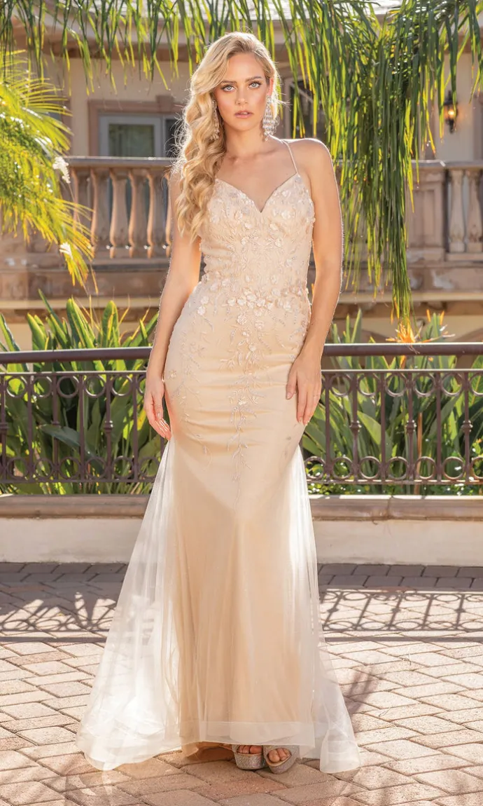 Tiny flowers shine on this beautifully embellished long prom dress. Simply gorgeous, this shimmering evening gown is fully-lined with a sparkly sheer overlay from the v-neckline to the floor. The embellished prom dress has thin shoulder straps that lace up over the open back, while the floor-length skirt smooths over the hips before jutting away from the knees and draping to the hem. Affordably priced under $200, this long prom dress is offered in misses and plus sizes for prom, fancy galas, and other formal events.