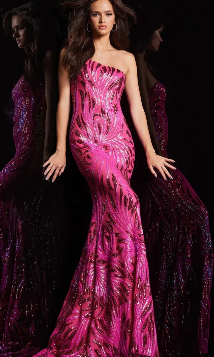 Turn heads in this stunning one shoulder mermaid dress by Jovani. The fitted silhouette and shimmering sequin print create a glamorous look that’s perfect for any formal event. With its unique one shoulder design, you’ll feel confident and elegant all night long. Make a statement in this exquisite Jovani creation.