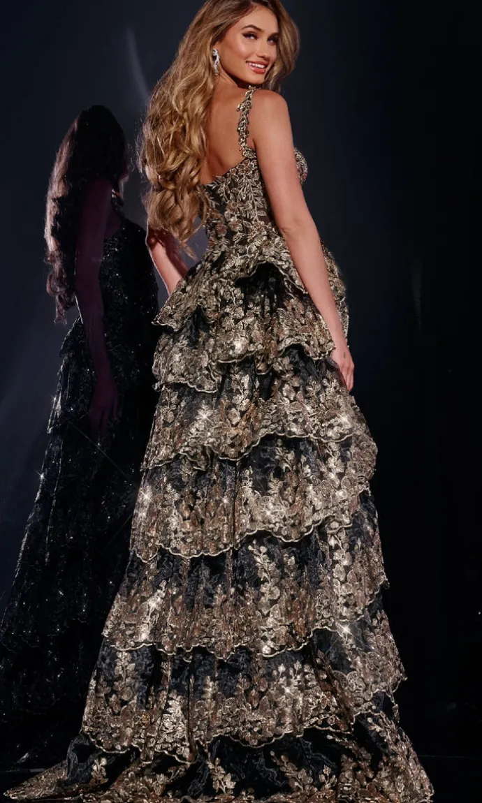 Wow the crowd at your next black-tie event with this Formal Long Dress 37630 by Jovani. Featuring a sweetheart neckline and scattered sequin prints, this dress offers a shimmery and glamorous look. The sheer bodice and ruffled tiers of the long skirt add a touch of sophistication and make a statement with every move. Elevate your style for a special evening with this designer prom dress.