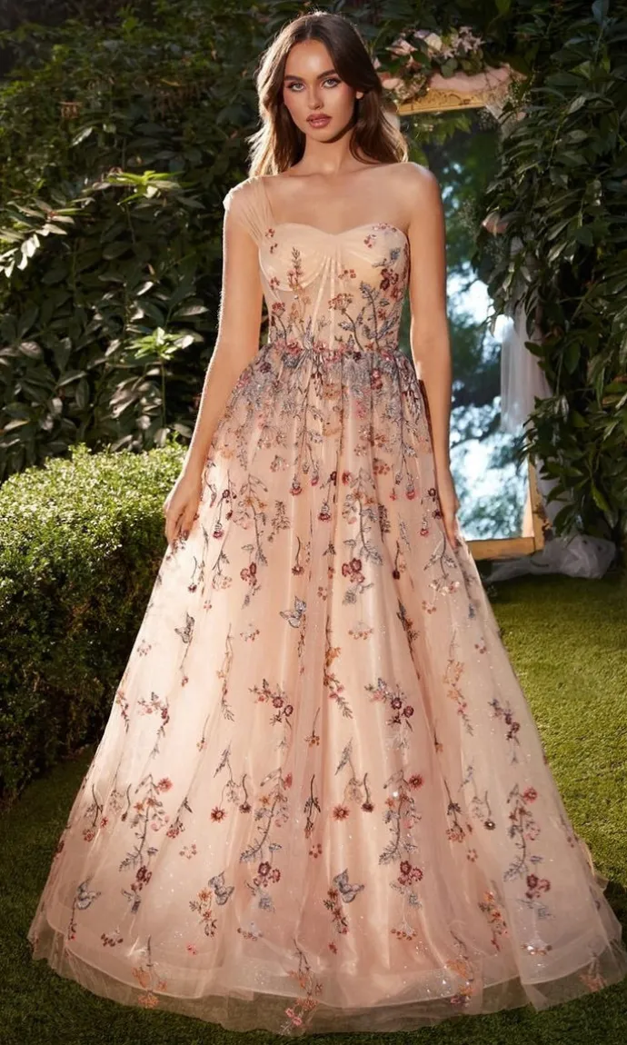 This exquisite champagne floral embroidered print, paired with a flattering A-line silhouette and a one shoulder ball gown, will make you feel like a work of art. The sweetheart neckline adds a touch of sophistication.