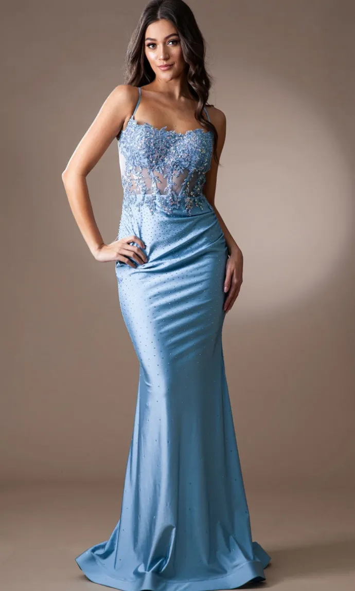 This elegant dress features a stunning open back, adorned with hot stone embellishments. The lace embroidered sheer corset bodice adds a touch of romance, making it the perfect choice for any formal event. Shine bright and feel confident in this one-of-a-kind dress.