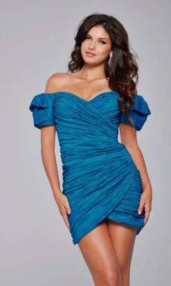 Get ready to celebrate in style with this gorgeous off-the-shoulder short sleeve homecoming dress 39014 from Jovani. Made to flatter with a faux-wrap silhouette and ruching from the neckline to the hem, this designer party dress is perfect for a variety of occasions, including homecoming, fancy dinner parties, and other semi-formal events. The ruffled banded sleeves add a touch of romance, while the tulip hemline on the mini skirt creates a flirty and unique look. Make a statement and show off your curves in this show-stealing short-sleeve cocktail dress.
