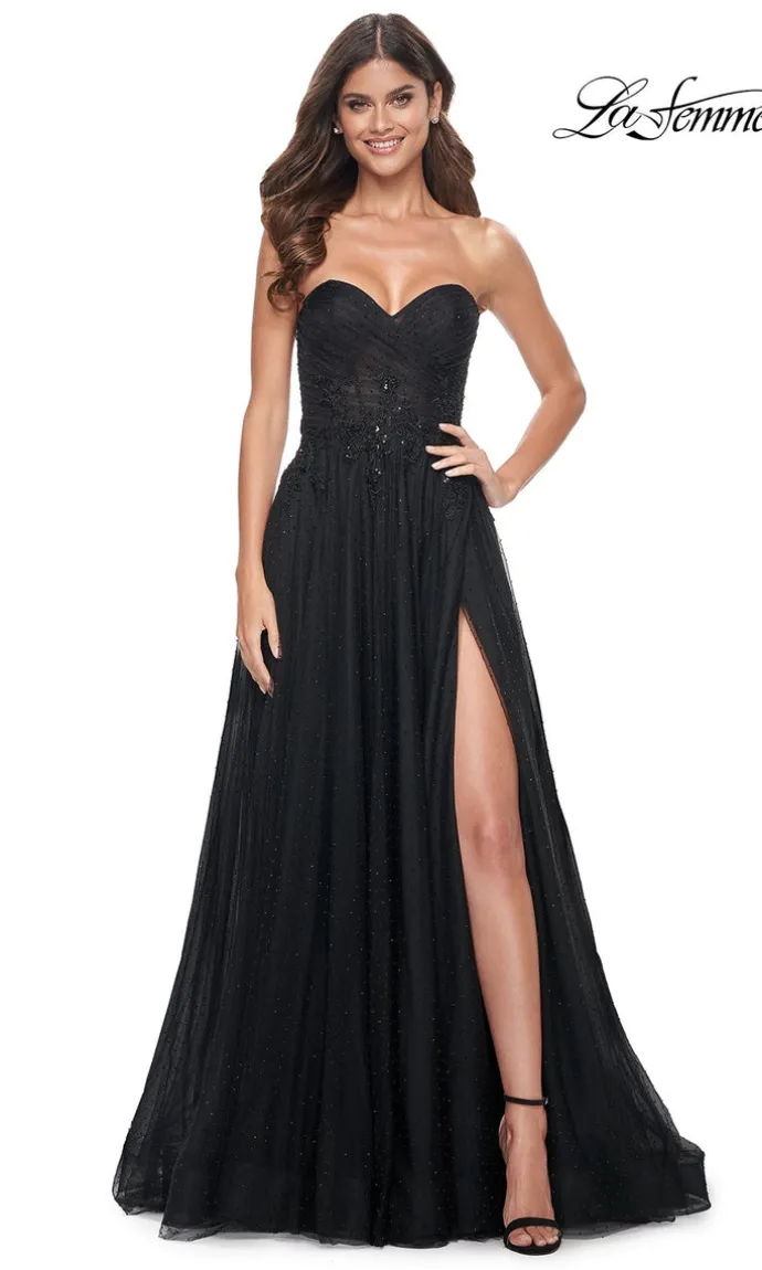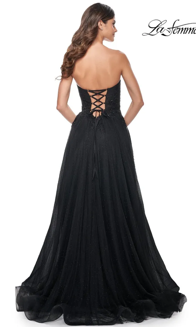 This black tulle dress features a sweetheart neckline and tonal lace applique details. The strapless design is perfect for a formal event and the A-line silhouette flatters all body types. Elevate your prom look with this elegant dress.