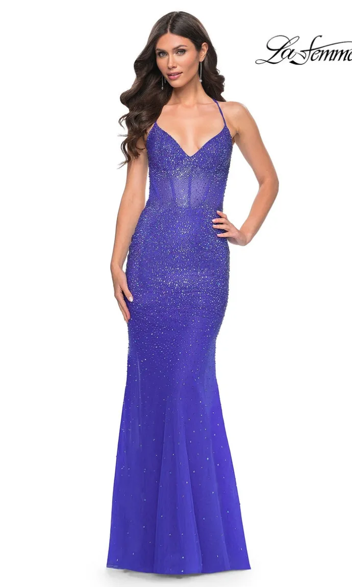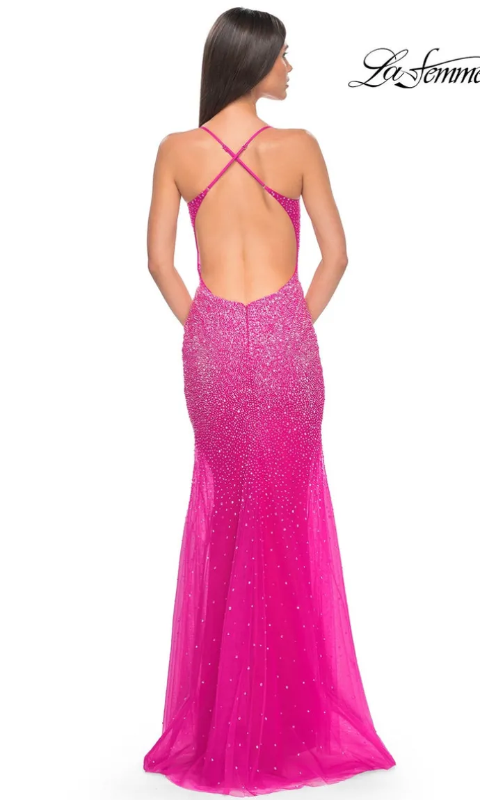 Get ready to turn heads at your next formal event with the La Femme 32007 Formal Prom Dress. This stunning mermaid dress features a sheer bodice with boning for a flattering fit, adorned with hot stone embellishments. With its long tulle design, you’ll feel like a true princess on your special night. Make a statement with style and grace in this beautiful dress.