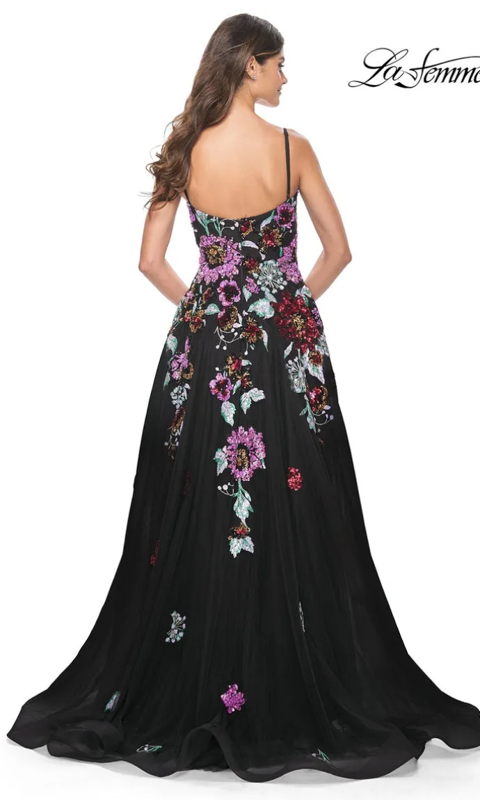 This black long tulle dress features a stunning floral sequin print and a side slit, making it the perfect choice for a formal event. Turn heads and exude sophistication with this A-line dress that will leave you feeling like a true fashionista.