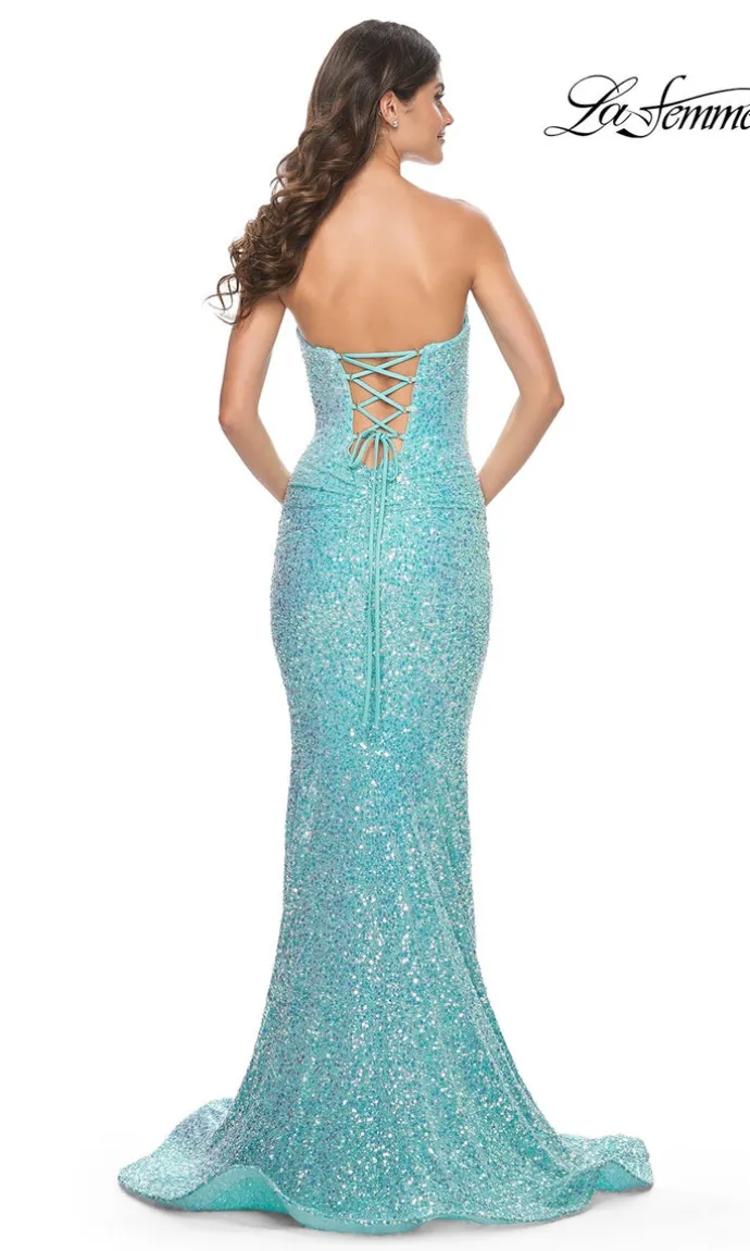 The strapless sweetheart neckline draws attention upwards while the lace up back adds a touch of romance. The floor length sequin fitted mermaid gown will enhance your curves and make you shine at any formal event.