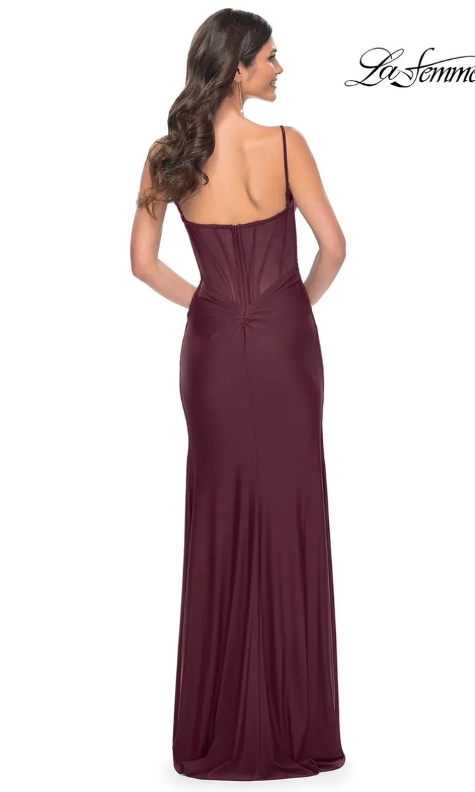 This elegant La Femme formal prom dress features a long, flowing jersey fabric and a flattering draped design. The sheer back adds a touch of sophistication, while the side slit allows for easy movement and a modern twist. Get ready to turn heads and feel confident in this must-have dress for any special occasion.