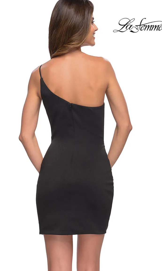 Turn up the heat in this simple short black party dress from the designers at La Femme. The one-shoulder short cocktail dress is a bodycon style that is as beautiful as it is versatile for homecoming, wedding receptions, and other semi-formal events. The simple little black dress includes a one-shoulder bodice with asymmetrical neckline, while the short skirt hugs the curves before ending in a sexy side slit that completes the look. You’ll want to wear this simple short black party dress again and again for the way it makes you look and feel.