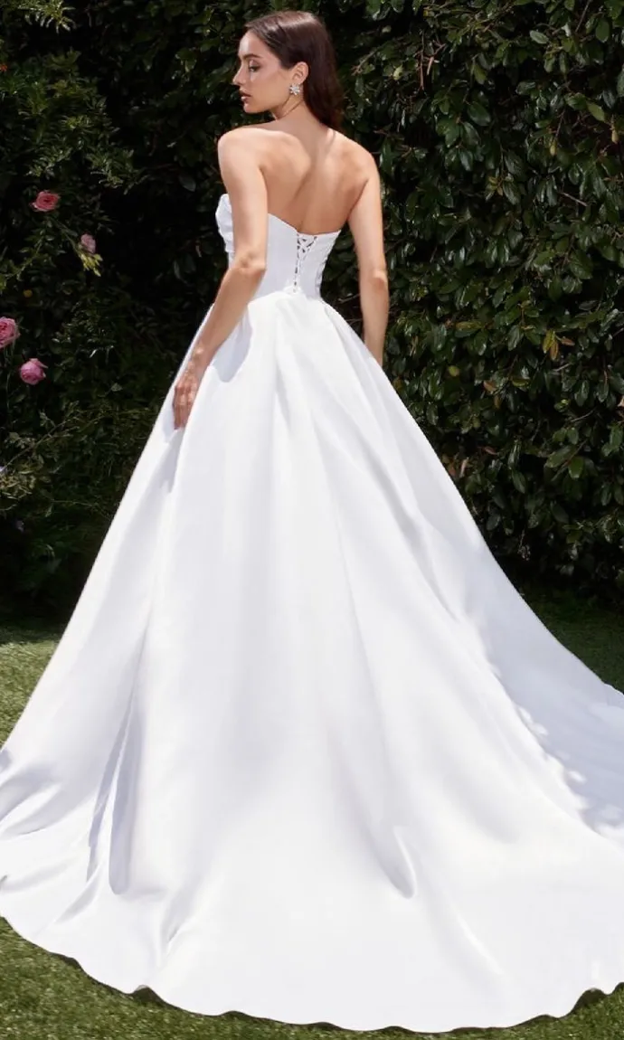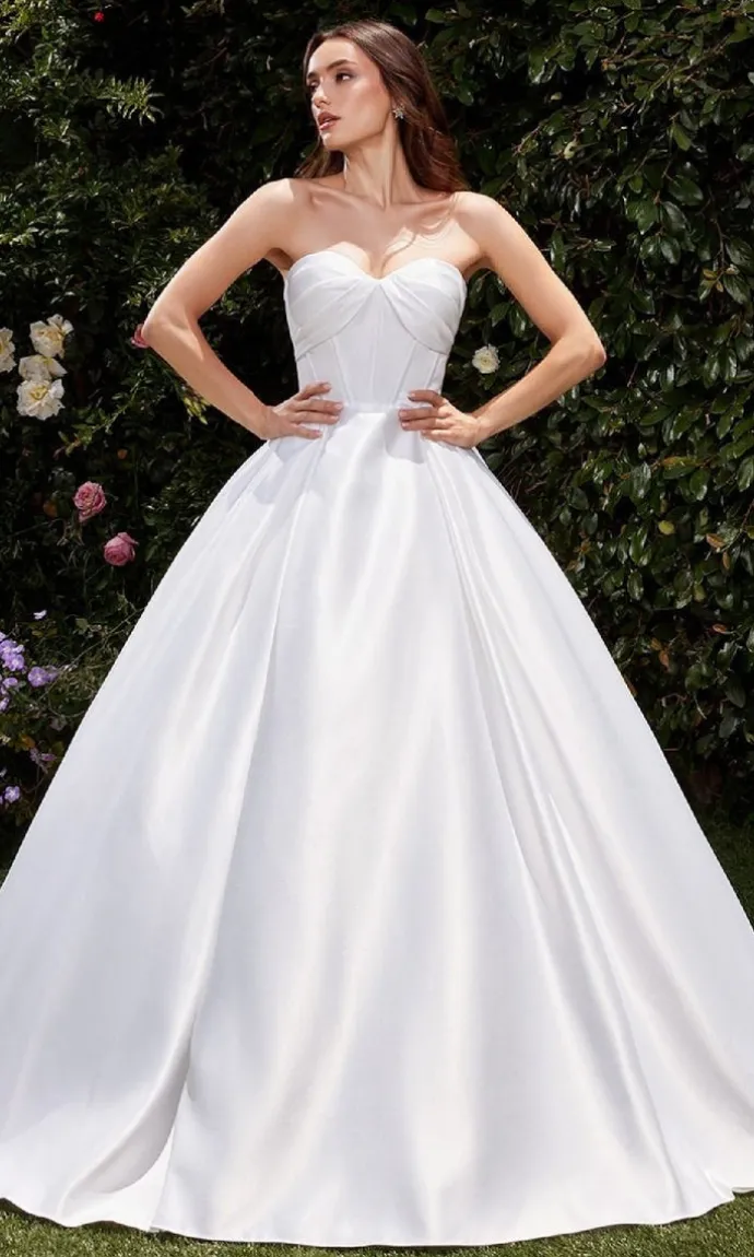 This off white satin formal ball gown is both classy and timeless, making it a perfect choice for any special occasion. The sweetheart corset bodice features a flattering pleated bustline, while the strapless design ensures that the dress is pleasing from every angle. With its voluminous skirt and convenient pockets, this white formal ball gown has a trendy twist. Whether you’re a bride looking for a ball gown wedding dress or a teen searching for a white prom ball gown, this stunning design is sure to make you feel classically beautiful.