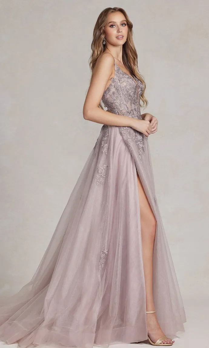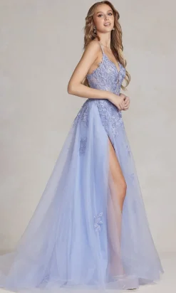 Here’s a beautiful lace-embellished long a-line prom dress that is fit for the red carpet. With scattered lace appliques form the plunging v-neck bodice to the skirt, this fancy long lace evening gown is a flirty fusion of romantic style and sexy vibes. The stand-out long formal dress has thin shoulder straps that lace up over the open back before tying into a fully adjustable bow for an upscale look at prom, galas, and other black-tie events. The fully-lined long faux-wrap skirt flows from the embellished waist of this fabulous long lace evening gown, before opening in a side slit and ending at a dramatic floor length. Offered in misses and extended sizes, this lace-embellished long a-line prom dress is as figure flattering as it is stylish.