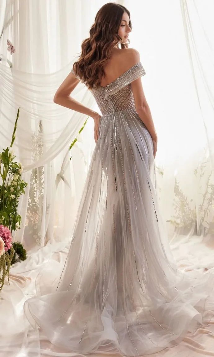Silver sequin fitted off the shoulder long formal dress with sheer overskirt and side slit.