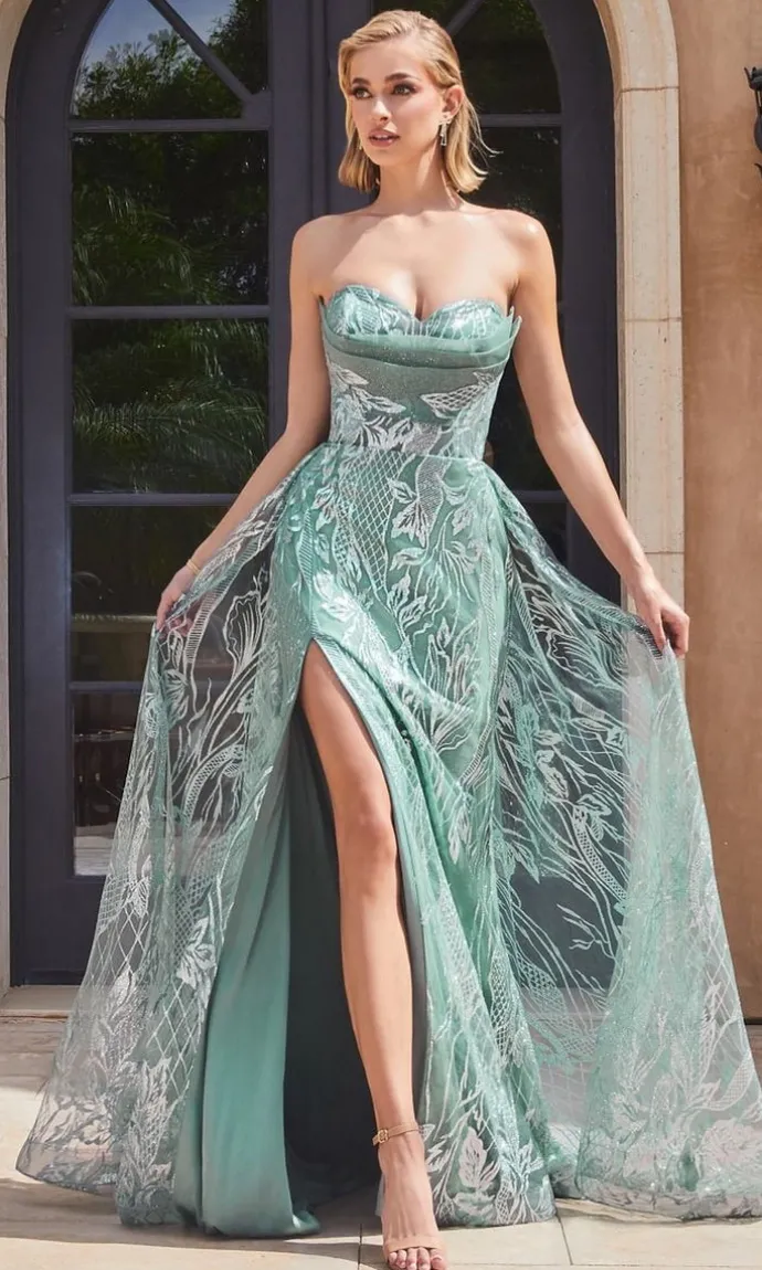 Get ready to sparkle and shine in the Long Formal Dress CB129 by Ladivine! The strapless design and swirling glitter print add a touch of glamour to any formal event. The overskirt is fully lined with a shimmering overlay, making it a standout choice for prom or military balls. Don’t miss your chance to dazzle in this stunning evening gown.