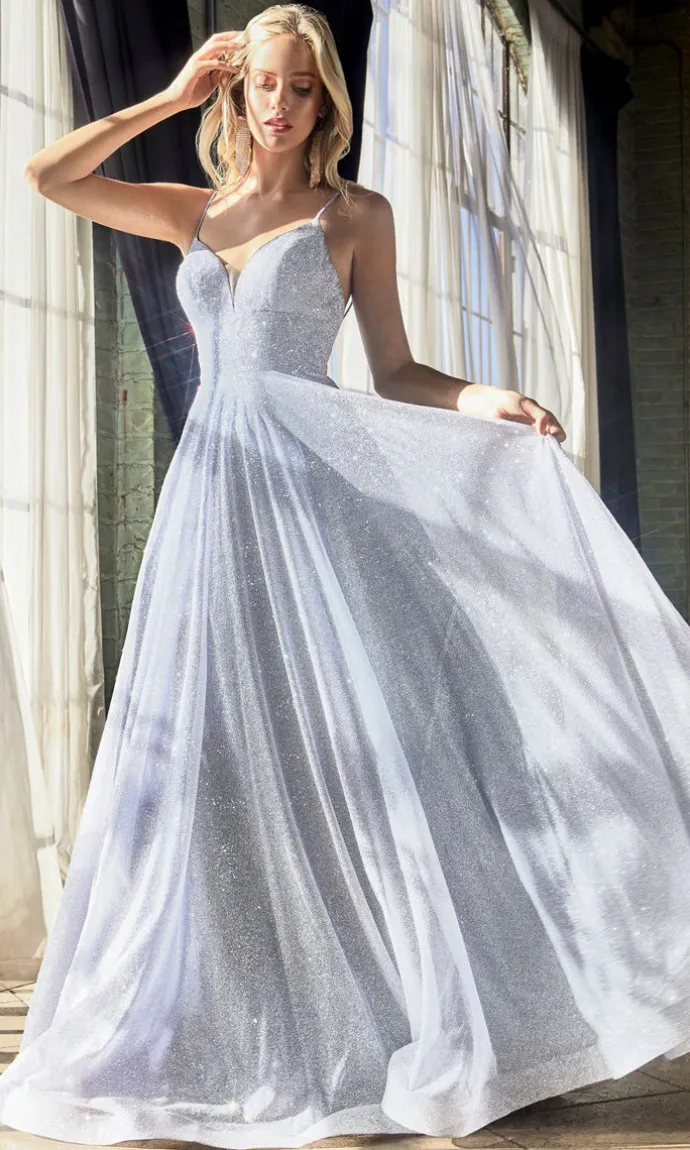 Pastel blue glitter a-line ball gown with sweetheart neckline.