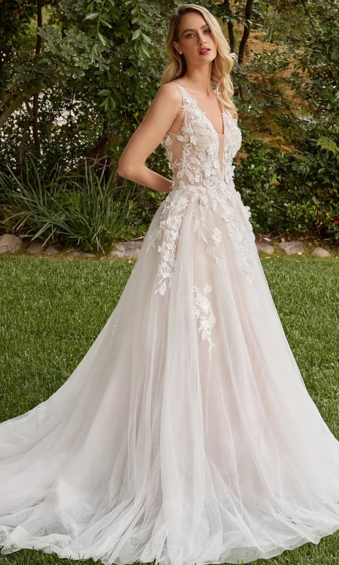 This Ladivine long formal dress is a showstopper with its 3-D floral embellishments and removable sheer sleeves, making it versatile for both the ceremony and reception. The deep scoop back and long a-line skirt add a touch of sexiness. Perfect for weddings, proms, and galas on a budget!