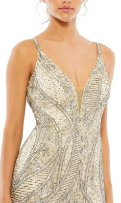 This stunning formal dress features intricate beadwork and a deep v-neckline, adding a touch of elegance to your look.