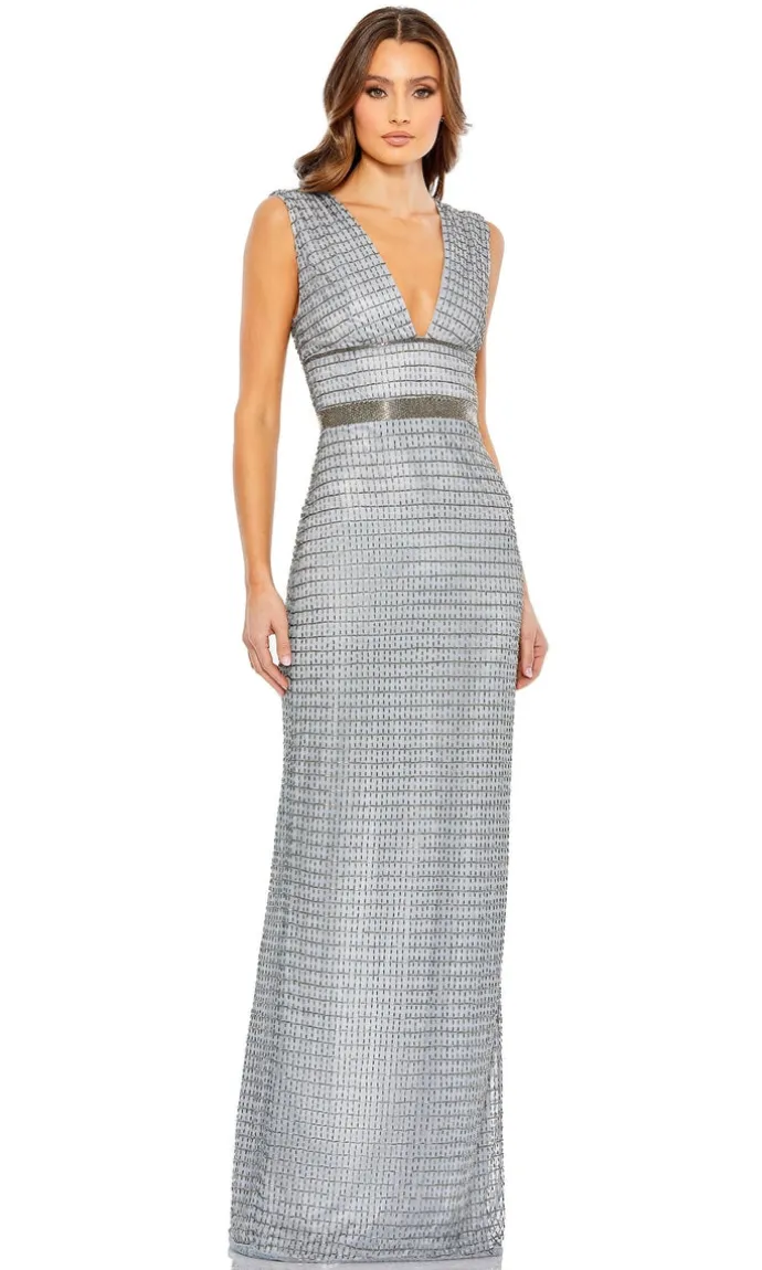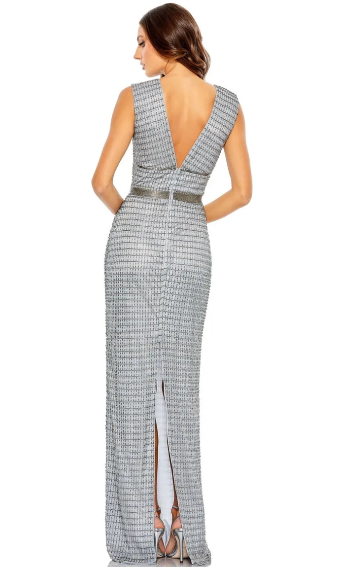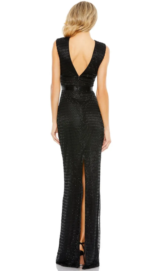 Experience an elegant and sophisticated look with this sleeveless dress, featuring a low v-neckline and open back that add a touch of allure. The fitted design and intricate beading complement each other perfectly, giving you a stunning silhouette. Perfect for any formal occasion, this dress is sure to make you stand out and feel confident.