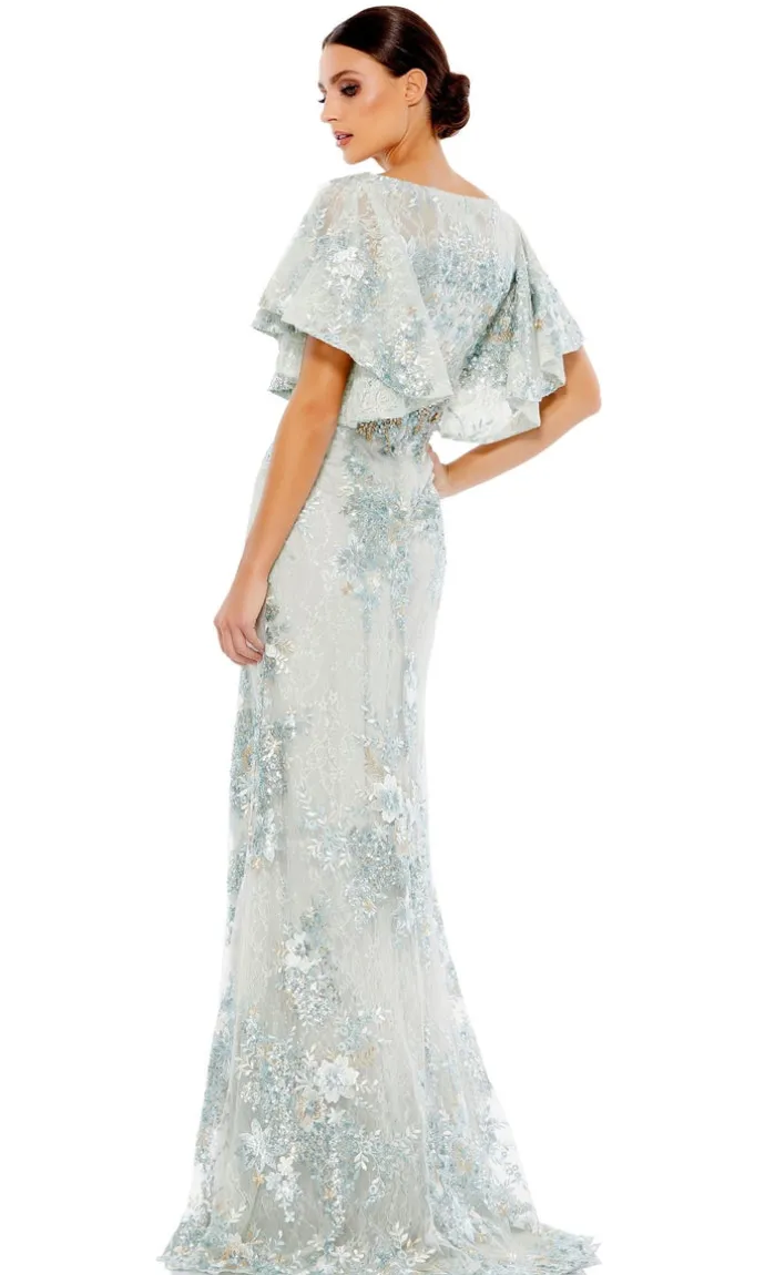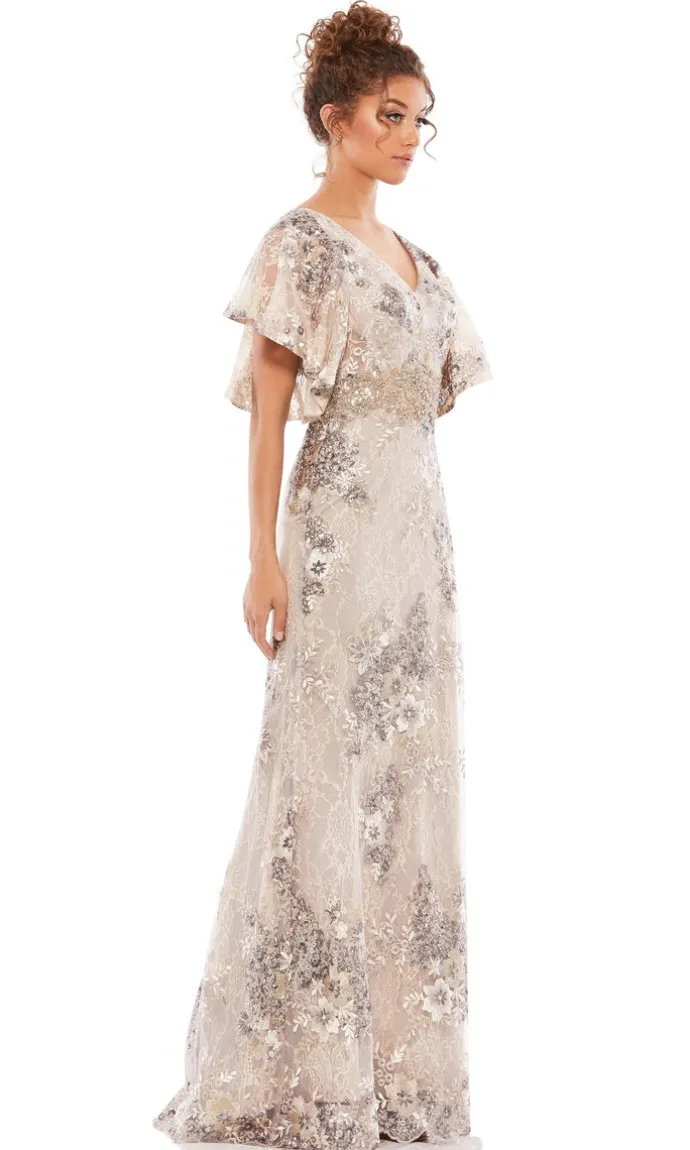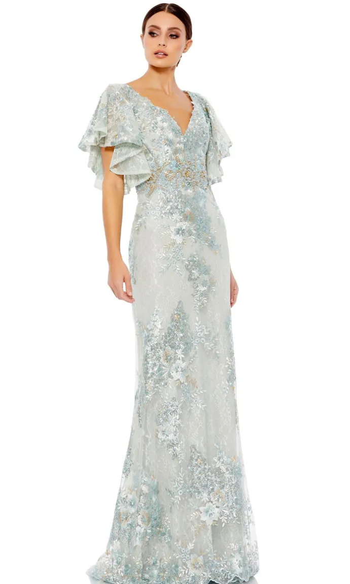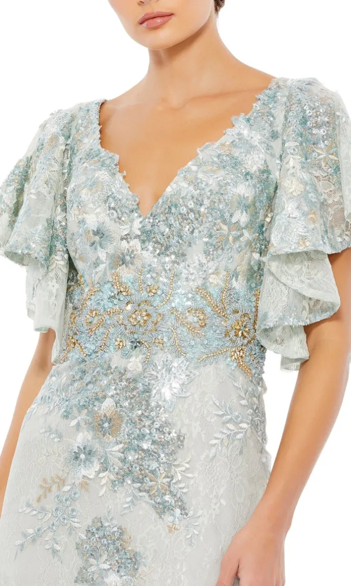 This stunning dress features intricate lace detailing, short flutter sleeves, and a flattering, fitted silhouette. You’ll exude confidence and femininity as you grace your next formal event.