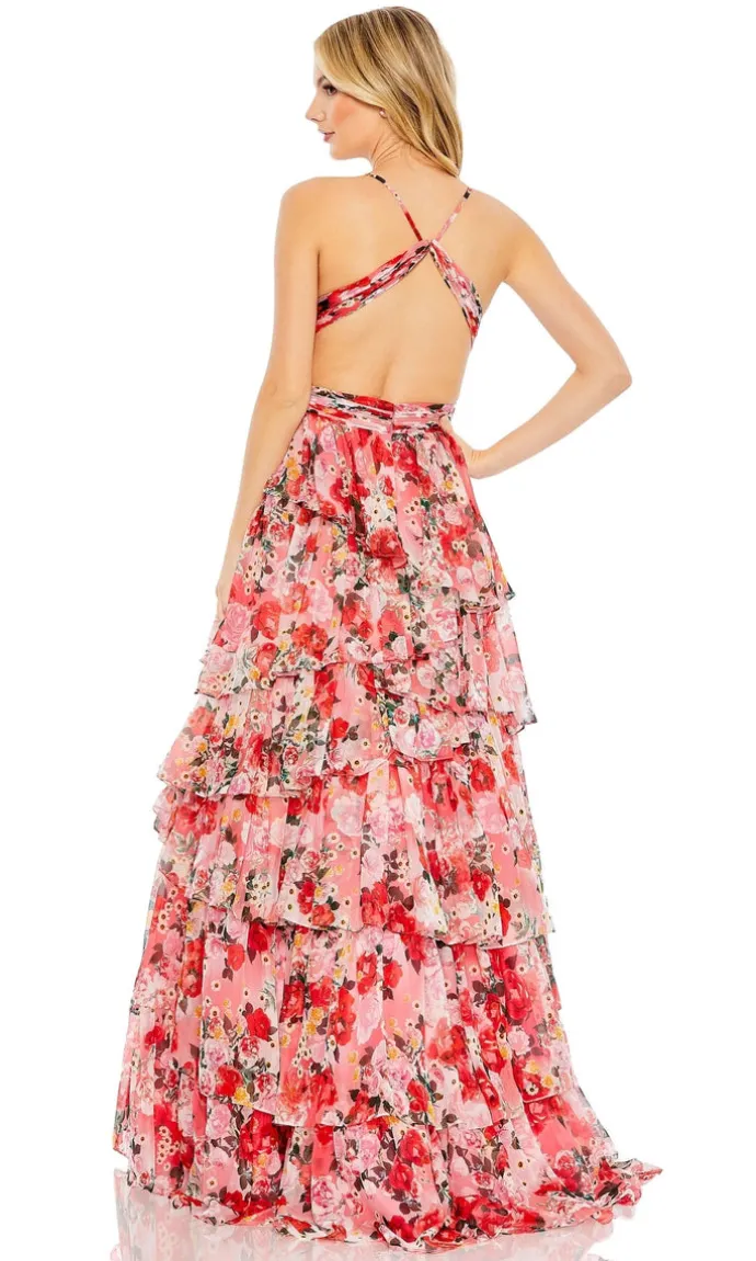 If you want to make a statement and stand out, our Mac Duggal Long Formal Dress 67985 is the dress for you. With a stunning pink print and ruffle layers, this a-line ball gown will make you feel like a true princess. The cut out sides and v-neckline add a bit of edge, while the open back adds a touch of allure. Get ready to be the center of attention in this showstopping dress.