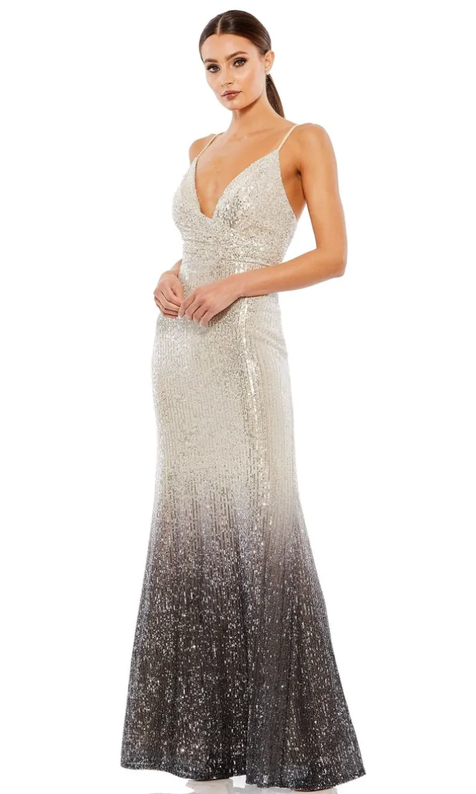 Elevate your style with this breathtaking ombre sequin mermaid dress. Designed with a flattering fitted silhouette, an open back, and a v-neckline, this dress will surely make you stand out in any crowd. Let the glamorous mermaid hem and dazzling sequins bring out your inner confidence.