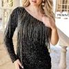 Mini sequin homecoming dress with one long sleeve and beaded fringe