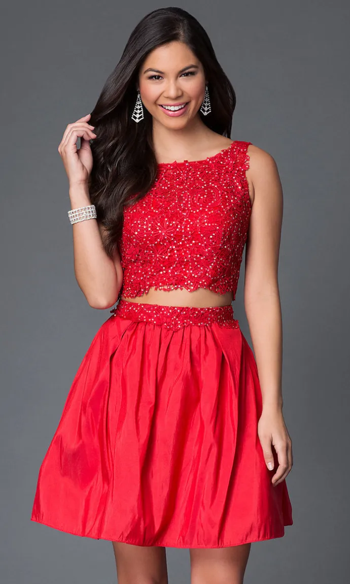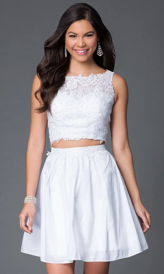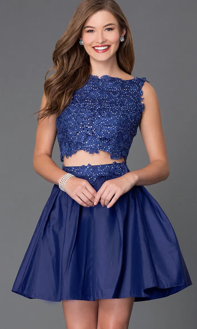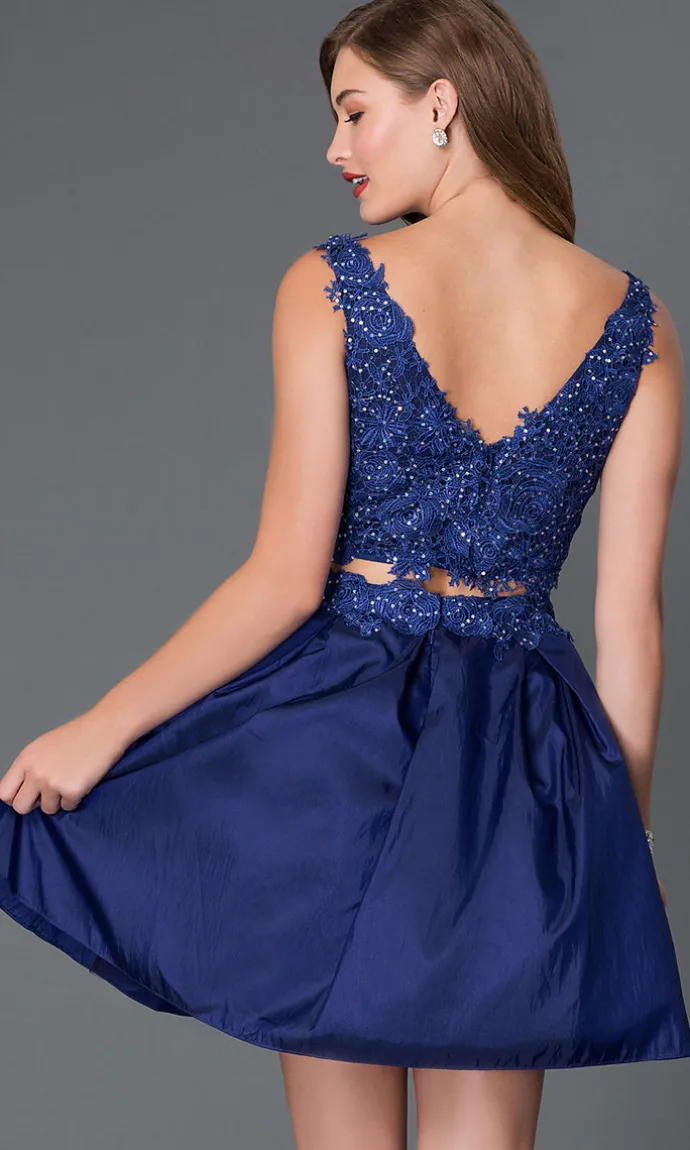 Light up the room in this sparkling beaded two-piece party dress at your next semi-formal celebration. The gorgeous special-occasion dress has a deep v-back and shimmering rhinestones on the delicate lace bodice. Matching lace and bead work adorns the natural waistline of the short a-line taffeta skirt. You can never go wrong in this dazzling short two-piece lace homecoming dress.