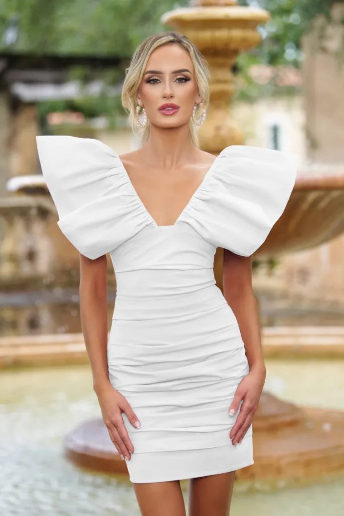 Statement-Shoulder Ruched Tess Mini Dress